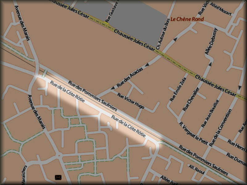 Statut : Voie communale. Longueur : 573 m. Largeur : 6 m. Début : Avenue des Marais. Fin : Rue de l'Epine Guyon. Période de création : Sur le plan d’urbanisme de l’aménageur les rues sont dénommées dès 1964. Nom précédent : Chemin Latéral Sud. Origine du nom : Porte le nom d’un lieu dit.