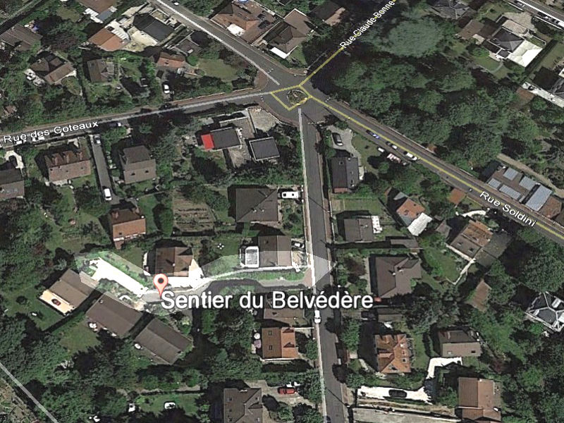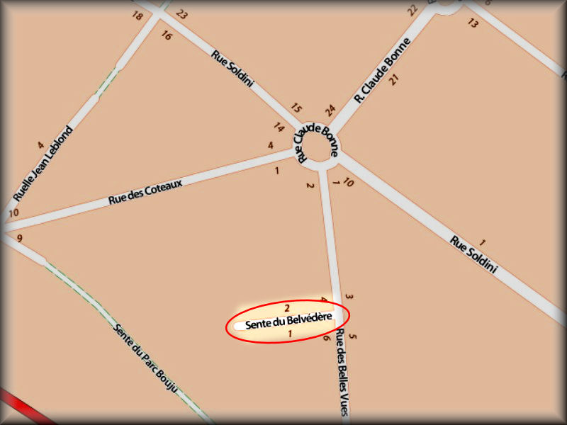 Quartier : des Fontaines Statut : Impasse. Longueur : ... Largeur : 4 m. Début : Rue des Belles Vues. Période de création : Figure sur la liste des rues après 1982. Nom de baptême successif : Chemin des Regards n° 63, Sente du Belvédère Remarque : Se termine par un sentier pédestre qui arrive au nouveau cimetière. |