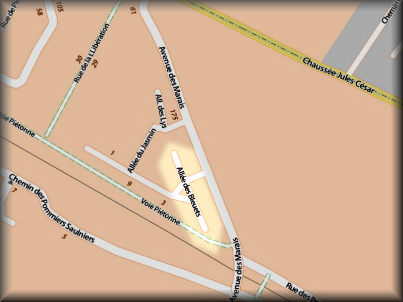 Statut : Voie privée. Longueur : 114 m. Largeur : 5 m. Début : Avenue des Marais. Fin : allée du Jasmin. Période de création : Décision du Conseil Municipal du 15 juin 1984 Origine du nom : Fleur des champs ou des montagnes. Le Bleuet de France est aussi le symbole commémoratif de la Première Guerre mondiale, le surnom de bleuet, était donné par les poilus de la Première Guerre mondiale aux soldats de la classe 1917 revêtus de l'uniforme bleu horizon.