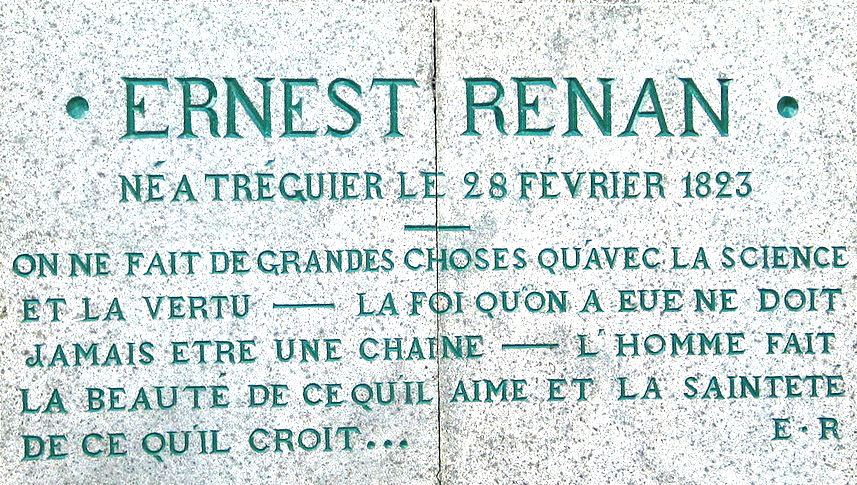 Origine du nom : Né le 28 février 1823 à Tréguier et décédé le 2 octobre 1892 à Paris, écrivain, philologue, philosophe et historien français. Une part essentielle de son œuvre est d'ailleurs consacrée aux religions avec par exemple son Histoire des origines du christianisme (7 volumes de 1863 à 1881) et sa Vie de Jésus (1863). Ce livre qui marque les milieux intellectuels de son vivant.