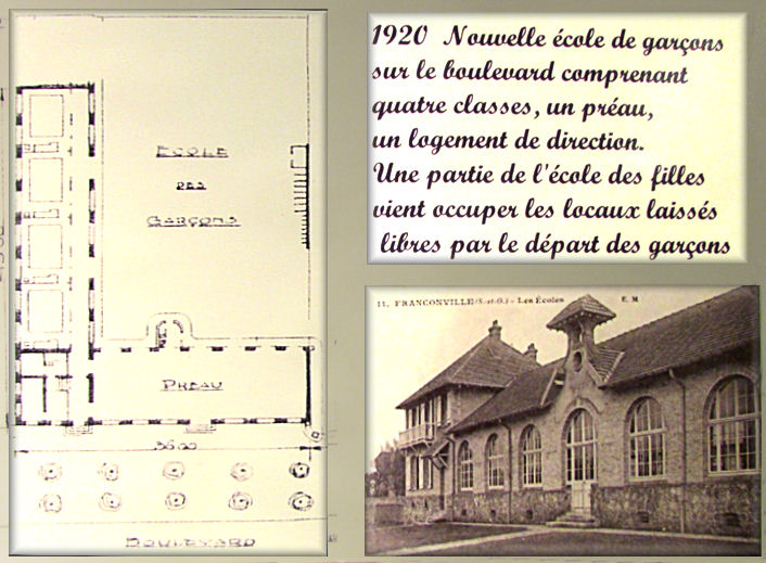 Le 23 décembre 1913, pose de la première pierre de l’école des garçons, comprenant quatre classes, un préau et un logement de direction. La construction fut interrompue le 14 septembre 1915 en raison de la guerre 14/18 et la quatrième classe est transférée à la salle vitrée de l’ancienne mairie.