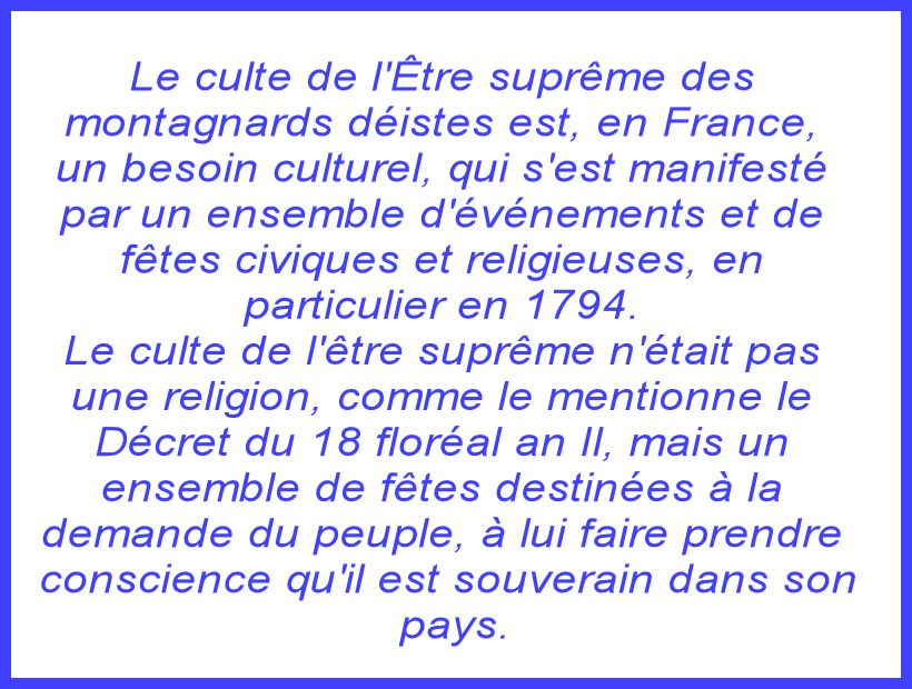 A la Révolution, la fête en l’honneur de l’Être Suprême sera célébrée la 20 prairial an II. L'ensemble de l’arrêt du comité de salut public, publié le vingt-trois floréal, proclame que le peuple français reconnaît l’Être suprême et l’immortalité de l’âme. Ensuite, plusieurs discours sont prononcés, suivis par des chants des élèves de l’institution publique, de cantiques et de distribution des textes.