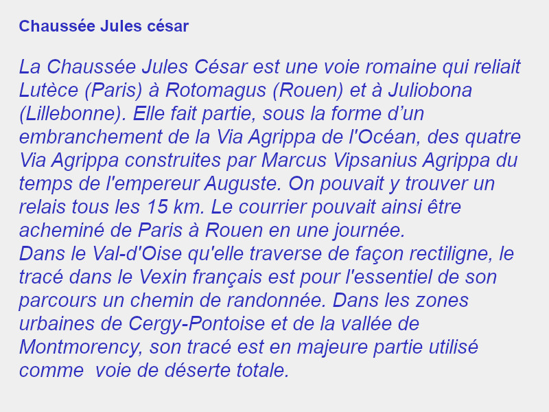 Après la conquête gauloise, les romains feront un réseau routier. L’empereur Auguste décide du tracé d’une chaussée de Lutèce vers la mer, elle passera dans la plaine de Franconville. Construite par Agrippa, gendre d’Auguste, dans les années 11 et 12 de notre ère, elle part de Lutèce, traverse Saint Denis et contourne la boucle de la Seine pour se diriger vers Franconville.