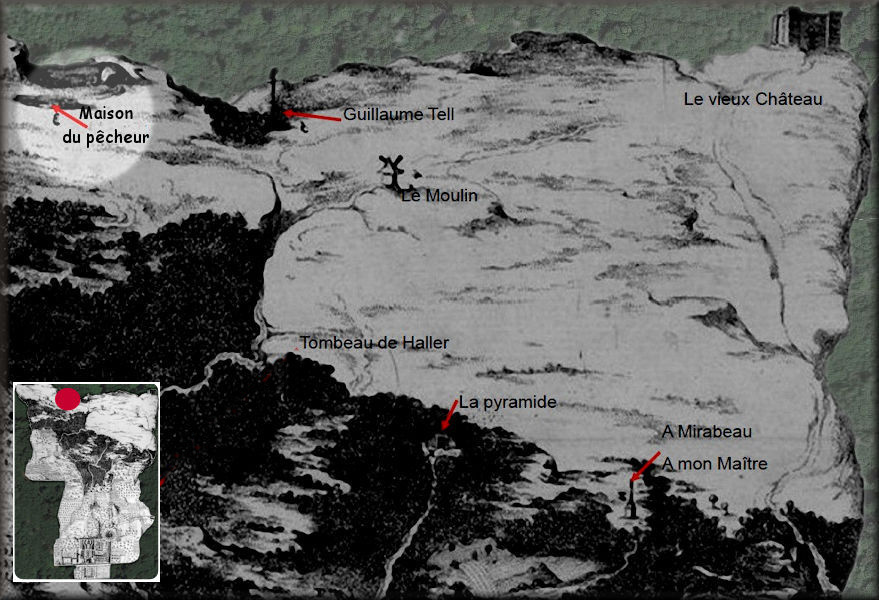 Une petite nacelle permettait de faire une courte promenade sur l'eau et d'aller voir le buste de Franklin élevé sur une espèce de promontoire, portant cette inscription :