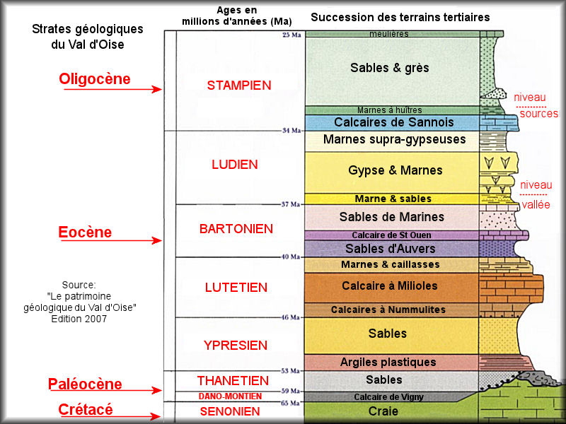 Ensuite on trouve une épaisse couche de sable et grès (dit "sable de Fontainebleau") de 20 à 30 m d'épaisseur employé surtout comme remblai pour la construction des routes dans la région. Puis une couche de marnes (très imperméables) de 6 à 7 mètres d'épaisseur, où les eaux infiltrées à travers le sable étaient arrêtées et ne pouvaient s'évacuer que par les nombreuses sources s'échappant des flancs de la colline.