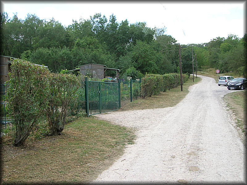 logo gps petitAu départ, le Chemin des Cotillons grimpe en pente douce, le long du "vallon" qui porte son nom, longeant sur sa gauche les "Jardins familiaux" de Franconville avec leurs petits chalets de bois et de l'autre côté une plantation de jeunes cerisiers (cerises de Montmorency).