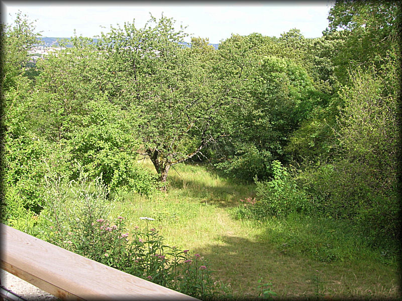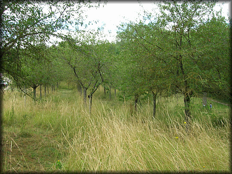 Après cette petite halte et quelques belles photos "panoramiques", on peut redescendre en serpentant dans les hautes herbes entre d'antiques arbres fruitiers (cerisiers, noyers,...) et quelques buissons d'églantiers, d'un ancien verger abandonné, (celui de : "M. Herriot et de ses ruches") pour rejoindre la clairière en contrebas.