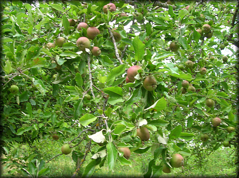 07 08 Puis plus loin sur la droite, sur une vaste parcelle à flanc de coteau, les silhouettes alignées d'innombrables noyers se profilent au milieu des hautes herbes, côtoyés par des plantations de pommiers et autres arbres fruitiers.
