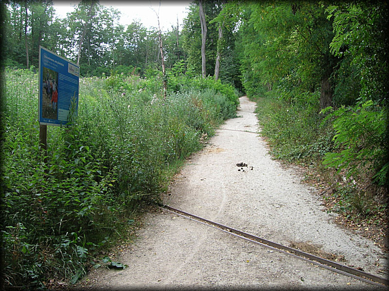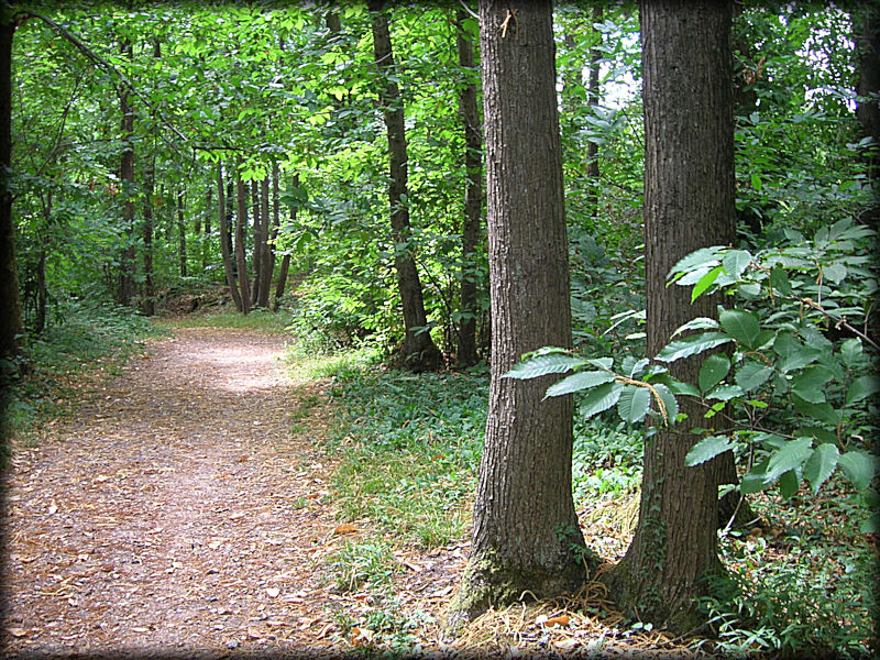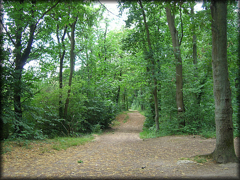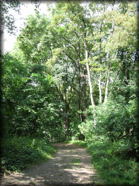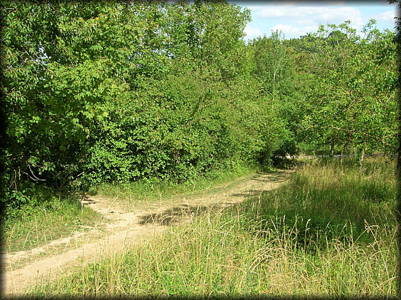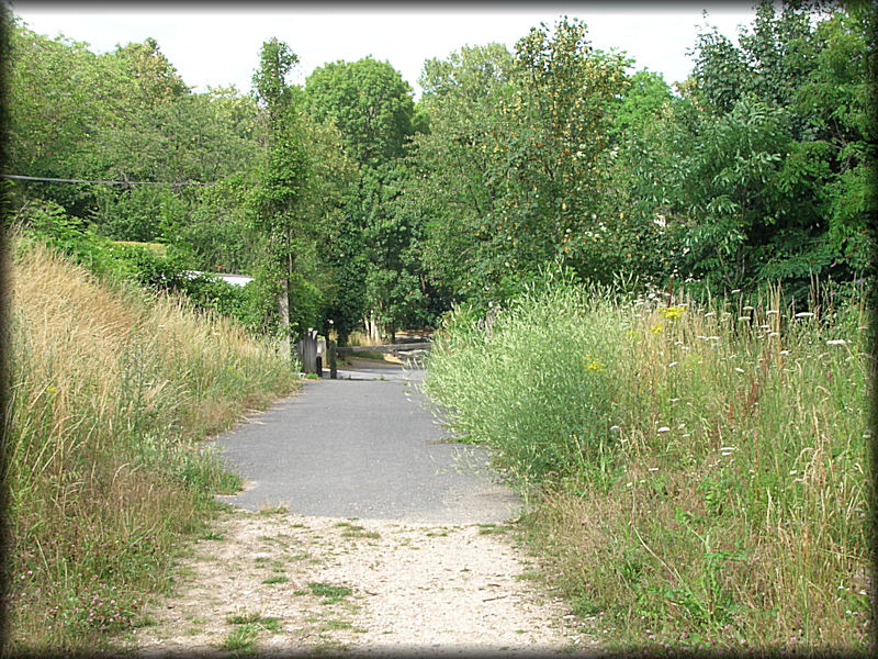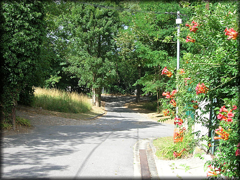 Le sentier s'enfonce ensuite dans la forêt, et se faufile entre noisetiers, charmes, acacias... et ronciers, pour rejoindre à nouveau le Chemin de Cormeilles bordé à cet endroit de hauts talus et de châtaigniers, où un peu plus bas se trouvait une Sablière.