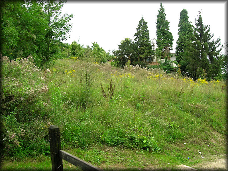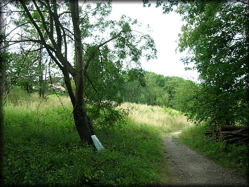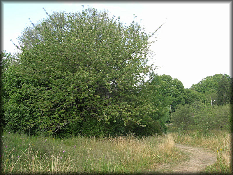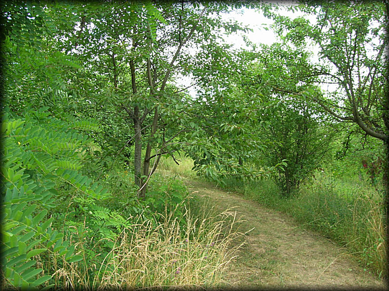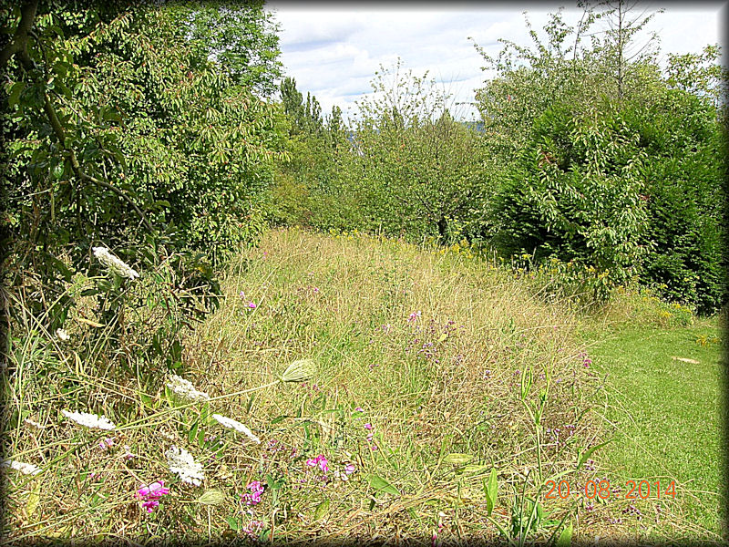 logo gps petitLe chemin dévale ensuite le coteau vers la gauche, sur une pente herbeuse à travers d'anciens vergers de pommiers et de pruniers et longe une haie d'aubépines, de prunelliers, d'églantiers, de cornouillers et autres arbustes sauvages. Il se déroule ensuite en empruntant une pelouse en friche parsemée au fil des saisons d'un cortège ininterrompu de fleurs des champs: Pois de senteurs, marjolaine, verges d'or, tanaisie, millepertuis et autres fleurs sauvages... pour passer enfin au pied d'un grand cerisier "hors d'âge" à la silhouette imposante.