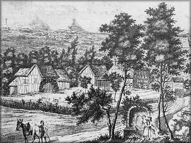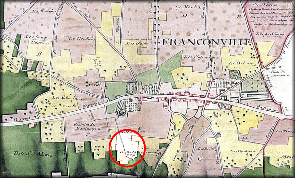 C'est sans doute à proximité de ce lieu (d'après une carte de 1785) que se trouvait "le Chaslée" (entouré en rouge sur la carte), petit hameau de "chalets suisses", une des nombreuses "curiosités" que le Comte d'Albon avait fait construire dans ses jardins qui s'étendaient du bas de Franconville jusqu'au sommet de la "Montagne", suivant un plan topographique de 1784.