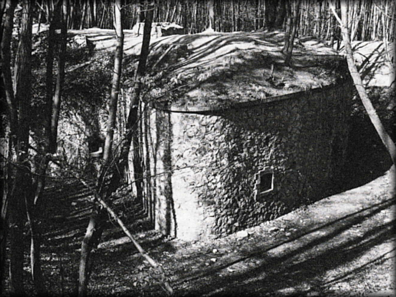 Une grande bâtisse isolée se dresse à cet endroit, posée à flanc de colline derrière des sapins (c'est la maison forestière de l'A.E.V). Plus haut et sur la gauche, à la lisière du bois des Rinvals, on devine à travers les feuillages la silhouette d'une plate-forme cimentée...