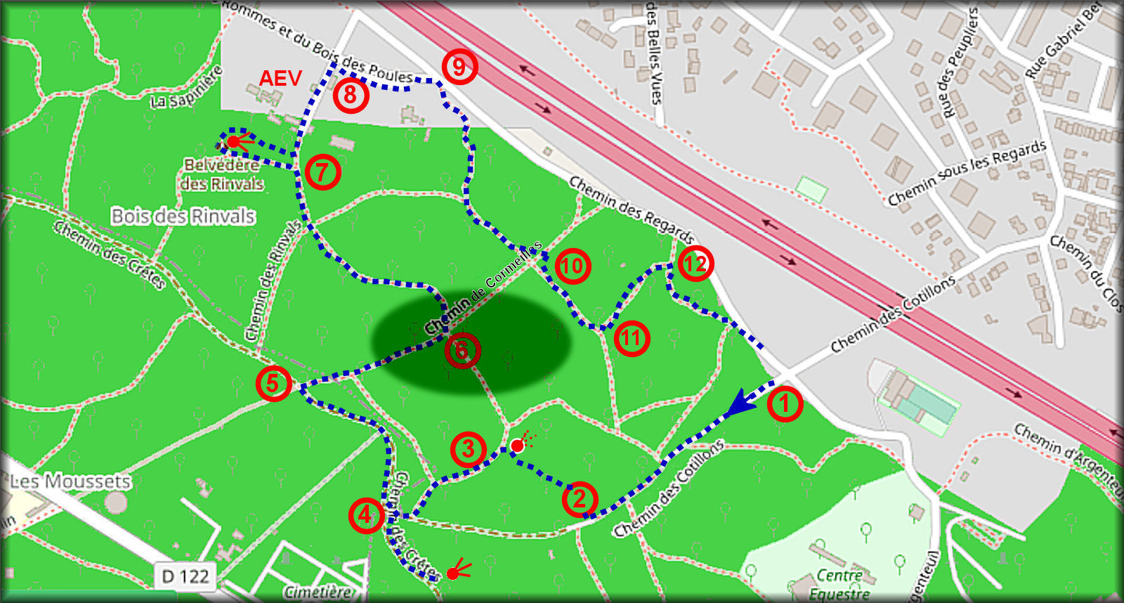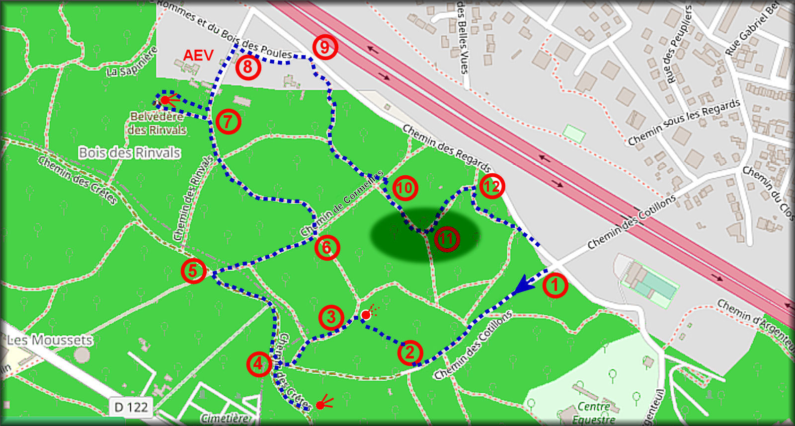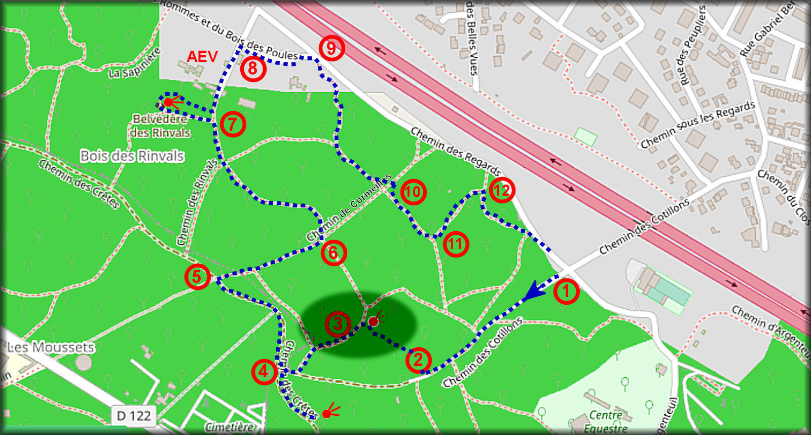 Le départ de ce circuit se situe au croisement du Chemin des Cotillons et du Chemin des Regards, aux panneaux d'information" de l'A.E.V. (face aux jardins communaux de Franconville)