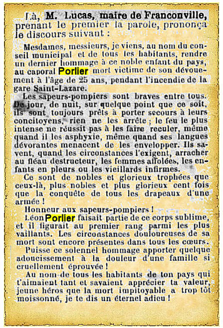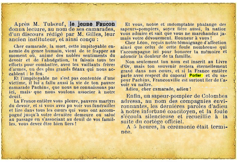 Le maire de Franconville Mr Lucas, Mr Muret, Mr Tuboeuf sous-lieutenant des sapeurs pompiers de Franconville, ont fait son éloge. Le jeune Faucon, au nom de ses camarades, lut un discours rédigé par Mr Gilles, leur ancien instituteur.
