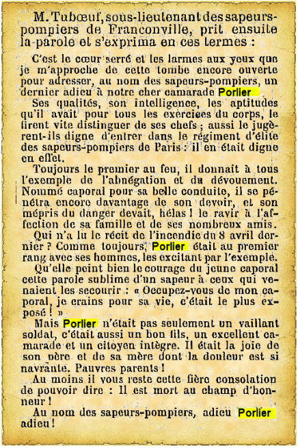 Pour terminer, un sapeur pompier de Colombes prononça au nom de toutes les compagnies environnantes les dernières paroles d’adieu à Léon Porlier.