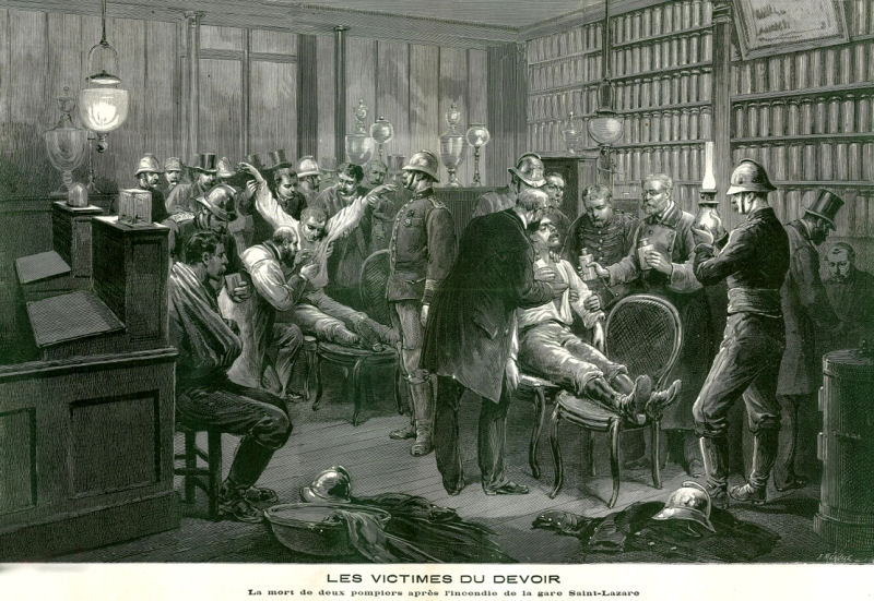 Un violent incendie s’est déclaré durant la nuit du samedi 7 au dimanche du 8 avril 1888 dans les vieux corps de bâtiments de la gare St Lazare, 15-17 rue d’Amsterdam à Paris, entre l’ancienne entrée des voyageurs de banlieue et la grande porte de sortie des voyageurs grandes lignes, dans la partie non encore atteinte par la pioche des démolisseurs.