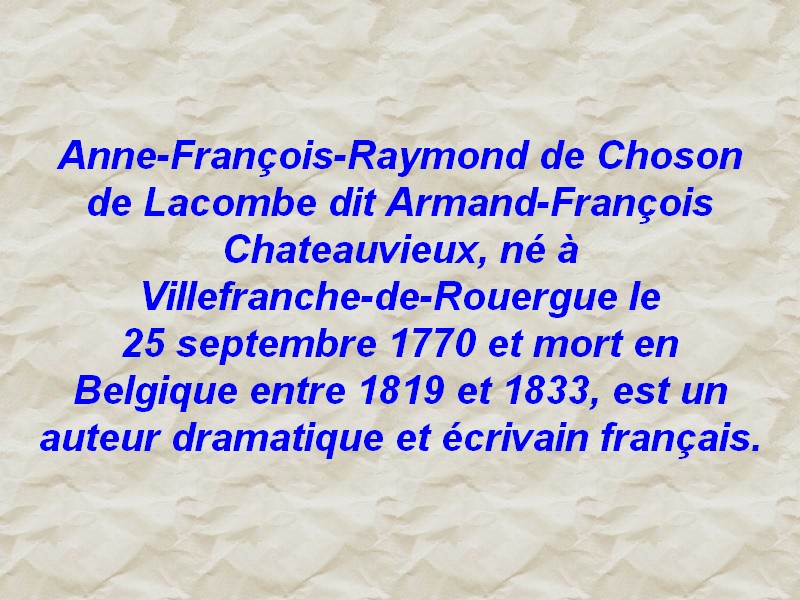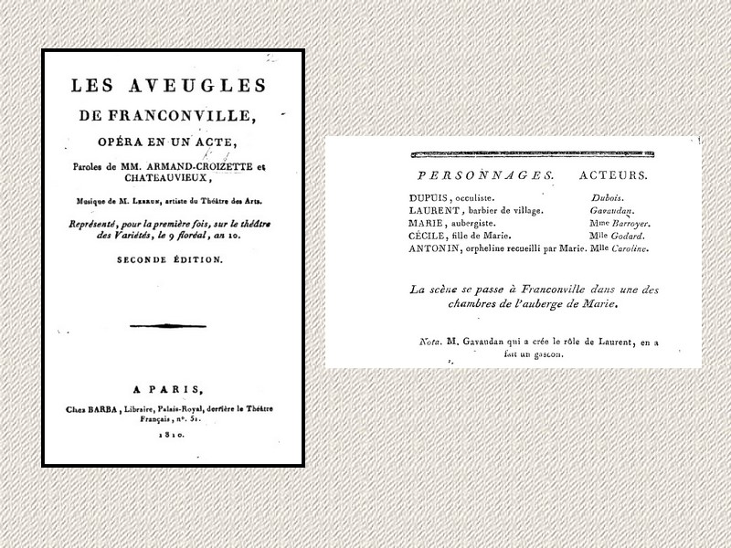 En 1802, deux auteurs dramatiques Croizette et Château-vieux s’associèrent pour écrire une petite pièce en un acte qu’ils qualifient d’opéra, présentant quelques couplets chantés. Leur nouvelle pièce intitulée « Les aveugles de Franconville » fut jouée pour la première fois au théâtre de la Montansier-Variété le 29 avril 1802.