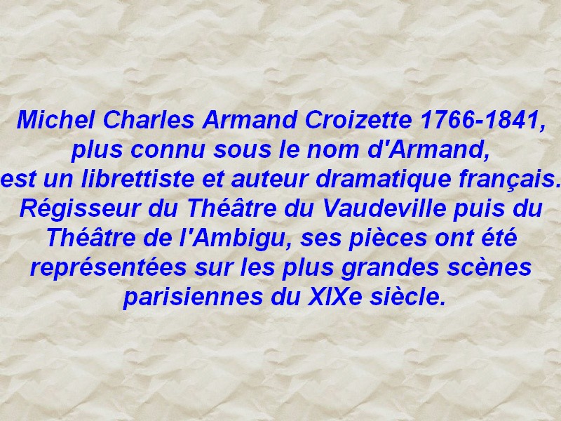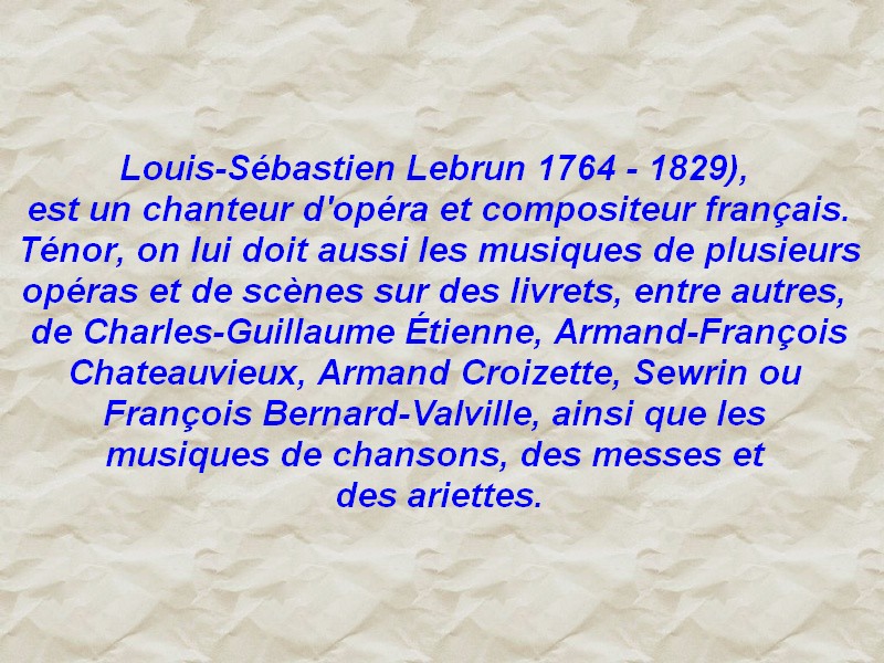 Armand Croizette 1766-1841 était un auteur dramatique. Régisseur de théâtre, ses pièces ont été représentées sur les plus grandes scènes parisiennes du XIX° siècle : théâtre de la Gaîté, théâtre des Variétés … Armand François Chateauvieux né en 1770 décédé en Belgique entre 1819 et 1833 était un écrivain et auteur dramatique. Ses pièces ont été représentées au théâtre des Variétés et au théâtre de l’Ambigu-Comique. Il sera condamné au bagne de Brest de 1803 à 1811 pour « faux en écriture ». Bonapartiste, il s’exile après la publication « l’Ambition de Napoléon dévoilée » pour éviter la prison. Tous deux s’associèrent pour la musique de cet opéra avec Louis-Sébastien Lebrun. Lebrun 1764-1829 est un chanteur ténor d’opéra et compositeur français. Nous lui devons des musiques de plusieurs opéras ainsi que les musiques de chansons, messes et ariettes.