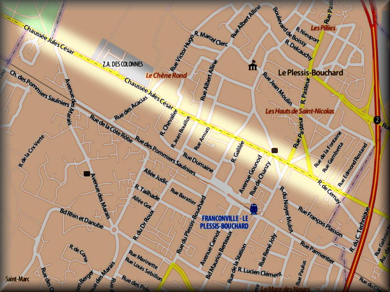 Voie romaine qui reliait Lutèce (Paris) à Rotomagus (Rouen). Mentionnée sur la Carte de Peutinger et l'Itinéraire d'Antonin, la voie qui reliait Lutetia (Paris) à Rotomagus (Rouen) par Briva Isara (Pontoise) a été identifiée au tracé remarquable de la chaussée Jules-César qui parcourt le plateau du Vexin français, dans le Val-d’Oise. Construite à partir du premier quart du ier siècle dans le cadre du vaste réseau routier aménagé par Rome en Gaule, elle se poursuivait jusqu’à l’estuaire de la Seine à Juliobona (Lillebonne) puis rejoignait la Manche, probablement à Caracotinum (Harfleur). Dans le Vexin français, la voie est conservée sous la forme d’un chemin étonnamment rectiligne qui desservait plusieurs villages et hameaux, et elle constitue l'un des principaux vestiges antiques du Val-d’Oise. En amont, elle a été dénommée sentier des Callais avant les marais de Soisy, chemin du Digne-Chien à Enghien, et parfois chemin ferré avant Pontoise. Remarques : Le 2 mars 1929, la chaussée Jules César est empierrée et raccordée au tout à l'égout. Le 10 avril 1952, viabilisation entre la rue du Plessis Bouchard et le bois de Boissy. Le 14 septembre 1955, fin de la viabilisation.