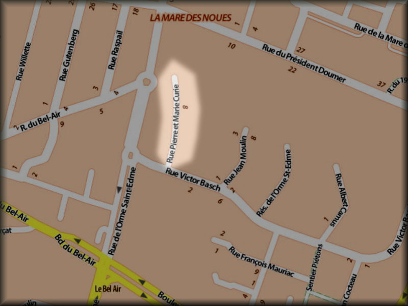 Statut : Voie privée. Longueur : 100 m. Largeur : 8 m. Début : Rue Victor Basch. Fin : Rue de l'orme Saint Edme. Période de création : 10 novembre 1978. Nom successif : Rue de la Chaîne au Regnard. Origine du nom :