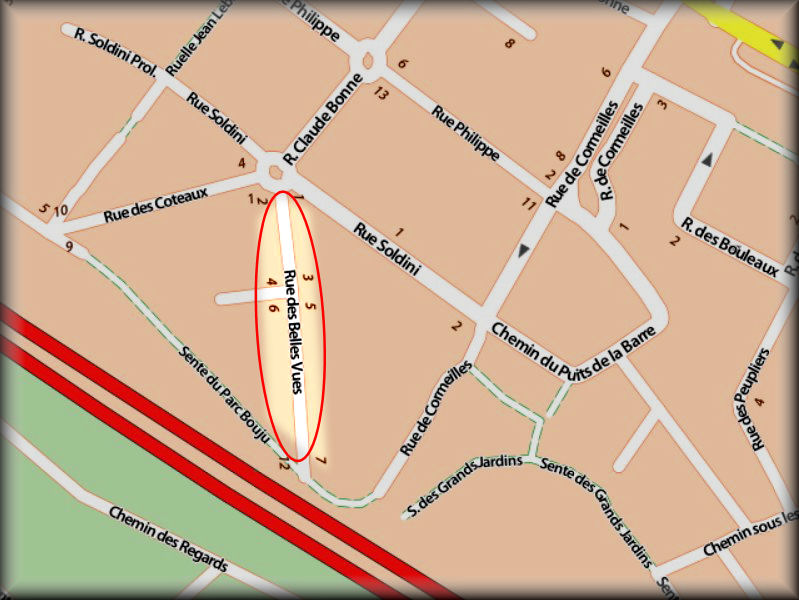 Quartier : des Fontaines Statut : Impasse. Remarques : Faisait partie du parc du château de Franconville du premier seigneur de Franconville Guillaume Bateste. Ce château féodal fut détruit, il se situait en limite de la rue de Paris. En 1780 le comte de Longaunay, colonel d'infanterie reconstruit le château sous forme d'une très belle demeure du XVIII° siècle, entourée d'un parc magnifique. De 1788 à la révolution, il sera la propriété d'Anne Léon duc de Beaufort Montmorency. Son nom est sans doute dû au point de vue que l'on découvre sur la vallée de Montmorency du haut de cette voie. En 1799 il sera acheté par l'Adjudant général J. B. Soldini, puis en 1819 par G. R. Bouju, en 1868 par M. Philippe. |