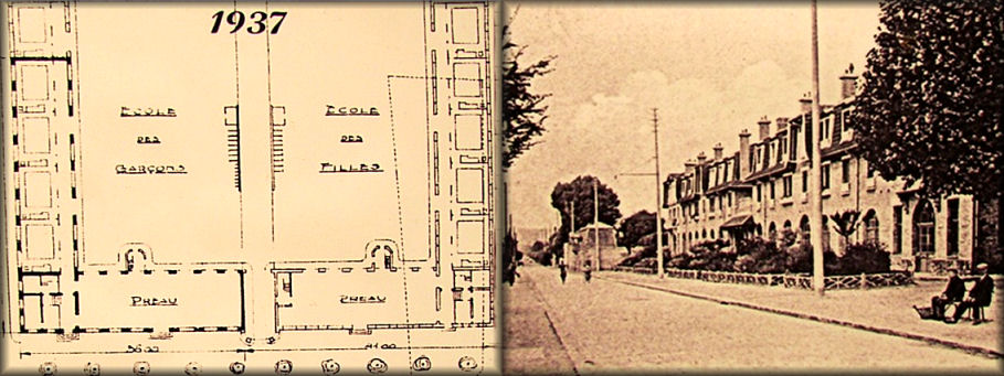 Pour faire face à l’augmentation de la population scolaire, l’école des garçons est modifiée. Les 4 classes sont surmontées d’un étage avec 8 logements au dessus du préau (photo à gauche). En même temps on bâtira une école symétrique pour les filles. De plus 2 salles de cantine et une cuisine complèteront l’ensemble photo à droite). Tout ceci est mis en service en 1932. |