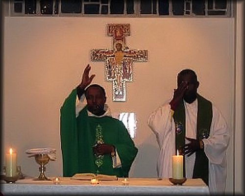 1ère ligne de photos : Chorale paroissiale dirigée par Chantal Dubourg, Père Emmanuel NDUWAYO et Père Hugues SEHOUNHOUEDO, Père Hugues SEHOUNHOUEDO,