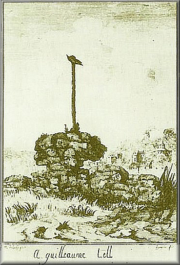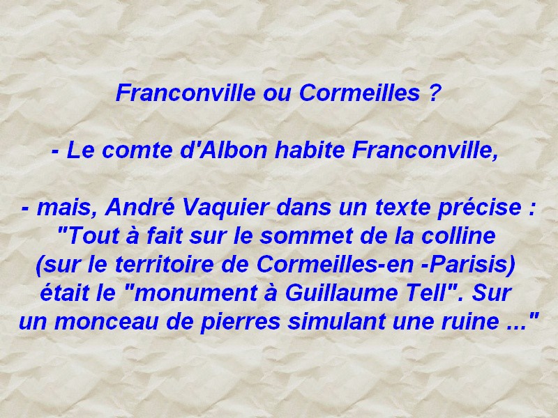 C’est ainsi qu’en 1782 au sommet de la colline et en son milieu sur un monceau de pierres, simulant une ruine, il avait dressé un long mat  couronné d’un chapeau semblable à celui de Guillaume Tell. Ce monument visible de loin, au pied duquel s’étendait un immense panorama, symbolisait la Liberté. Il est certain que l’emplacement avait été choisi avec soin par le Comte d’Albon, ami des philosophes, afin de manifester l’esprit de liberté dont il était épris. C’est le premier arbre de la Liberté qui fut dressé en France avant la Révolution. Alciat, dans son livre sur les emblèmes donne le bonnet comme l’emblème de la liberté. C’était celui dont on coiffait les esclaves affranchis pour cacher leur tête rasée et qui  était devenu le bonnet rouge de la Révolution. Nous voyons donc que le Comte d’Albon était dans la tradition en perchant le chapeau de Guillaume Tell en haut de son mat de la Liberté. Deux inscriptions, l’une à Guillaume Tell et la seconde en français "A la Liberté, Camille d’Albon 1782". C’est en 1792, qu’un arbre fut planté à Franconville. Les gardes nationales venaient d’être organisées par district, 29 septembre 1791, en conséquence, les gardes nationales d’Ermont et de Franconville avaient été réunies, un effectif de 450 hommes était placé sous le commandement en premier du Sieur Broutin seigneur de Cernay et en second, du sieur Candas, chirurgien à Franconville.