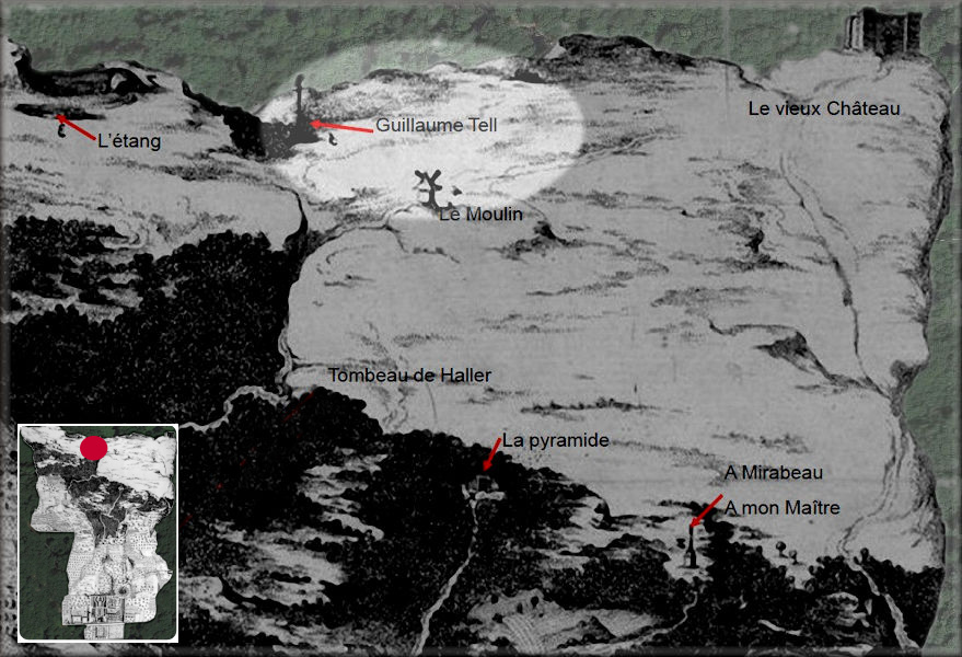Alciat donne le bonnet (pileus) comme emblème de la Liberté. C'était celui dont on coiffait les esclaves affranchis pour cacher leur tête rasée et qui est devenu le Bonnet rouge de la Révolution. On voit donc que le comte d'Albon était dans la tradition d'Alciat en perchant le chapeau de Guillaume Tell en haut de son mât de la Liberté. Il est curieux de constater que Le Prieur, qui n'omet par ailleurs de citer aucune des inscriptions qui abondaient dans ces jardins, passe sous silence celles qui accompagnaient ce monument à Guillaume Tell. Les trouvait-il trop hardies ? Dulaure comble cette omission. Il dit qu'on y lisait deux inscriptions :