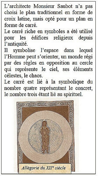 L’axe principal est la diagonale du carré qui joint l’entrée principale à l’autel. Celui-ci est éclairé par la verrière du clocher, il mesure 31,40 mètres peut-être un clin d’œil à Pie.