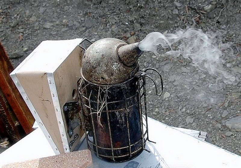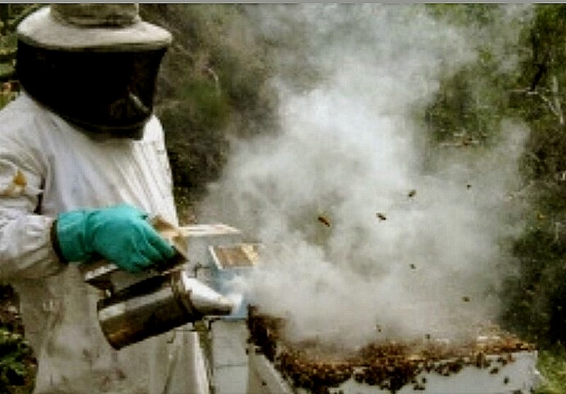 Il tient un ustensile bizarre en forme de cafetière à bec pointu d'où s'échappe par bouffées une fumée blanche qu'il dirige vers les ruches. Ses gestes sont lents, précis et lui donnent une démarche de pantin articulé…au ralenti.