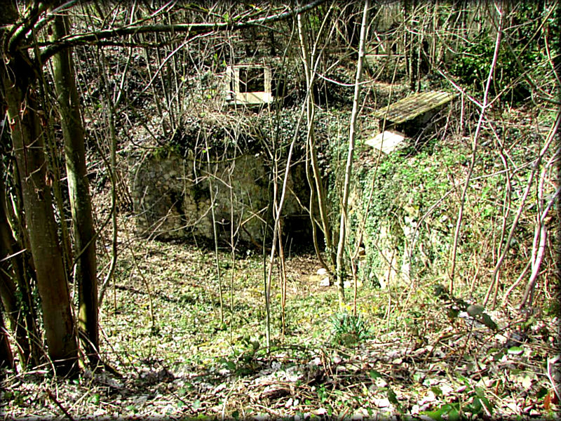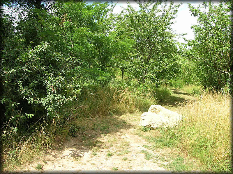 Clogo gps petitet endroit étant très proche de l'autoroute et de ses nuisances sonores, on peut s'en éloigner pour retrouver le calme de la forêt, en empruntant un petit sentier sur la droite qui contourne une imposante cépée de laurier. Il traverse d'un côté un ancien verger de pruniers (des quetschiers) et de l'autre une rangée de vénérables cerisiers (bigarreaux) aux ramures sombres et torturées.