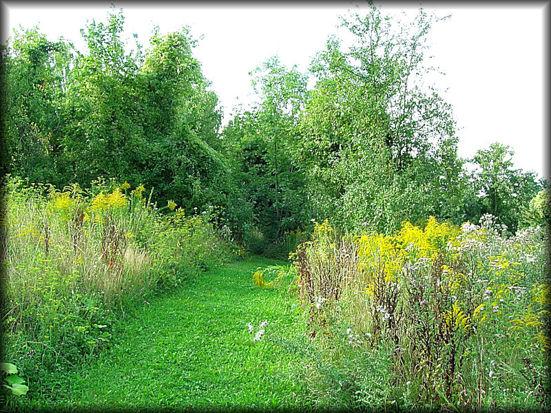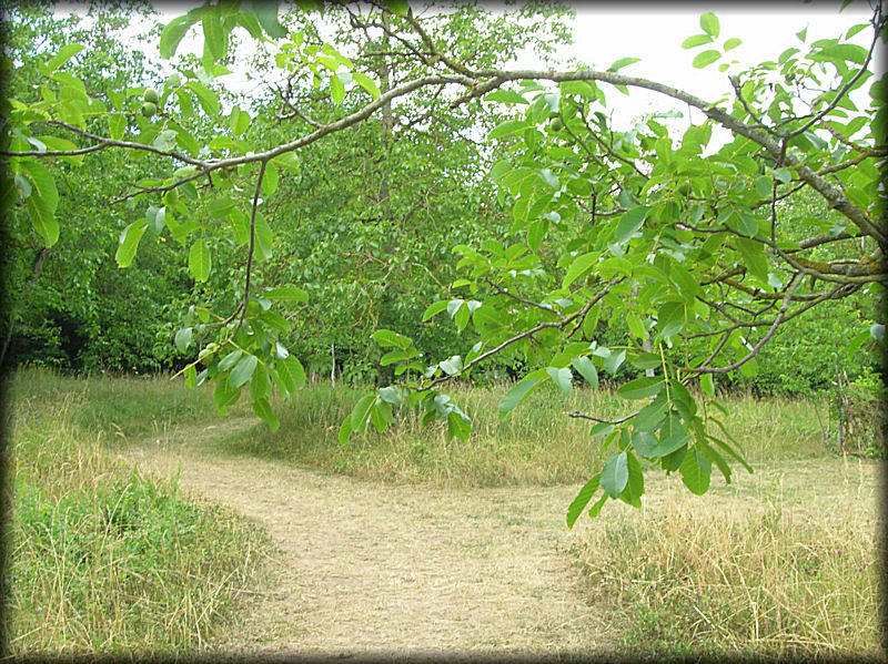logo gps petitLe chemin dévale ensuite le coteau vers la gauche, sur une pente herbeuse à travers d'anciens vergers de pommiers et de pruniers et longe une haie d'aubépines, de prunelliers, d'églantiers, de cornouillers et autres arbustes sauvages. Il se déroule ensuite en empruntant une pelouse en friche parsemée au fil des saisons d'un cortège ininterrompu de fleurs des champs: Pois de senteurs, marjolaine, verges d'or, tanaisie, millepertuis et autres fleurs sauvages... pour passer enfin au pied d'un grand cerisier "hors d'âge" à la silhouette imposante.