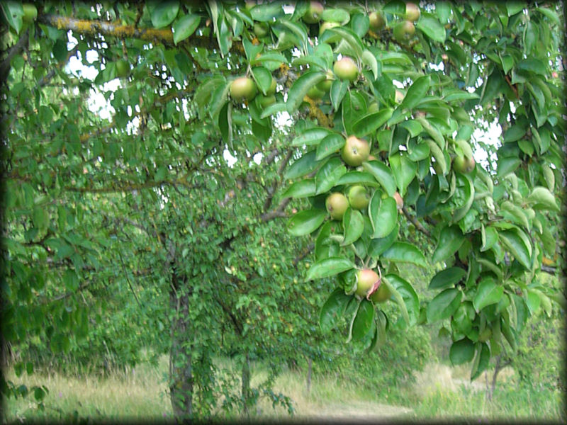 07 08 Puis plus loin sur la droite, sur une vaste parcelle à flanc de coteau, les silhouettes alignées d'innombrables noyers se profilent au milieu des hautes herbes, côtoyés par des plantations de pommiers et autres arbres fruitiers.