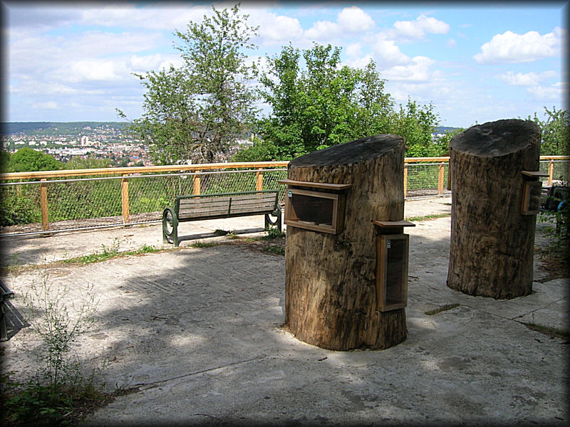 Depuis cette "terrasse" ensoleillée, idéalement située en balcon et agrémentée de bancs, de sièges en rondins et "d'arbres à livres", on peut se reposer, se distraire ou se cultiver et jouir d'un panorama unique sur toute la vallée, avec Franconville à nos pieds.