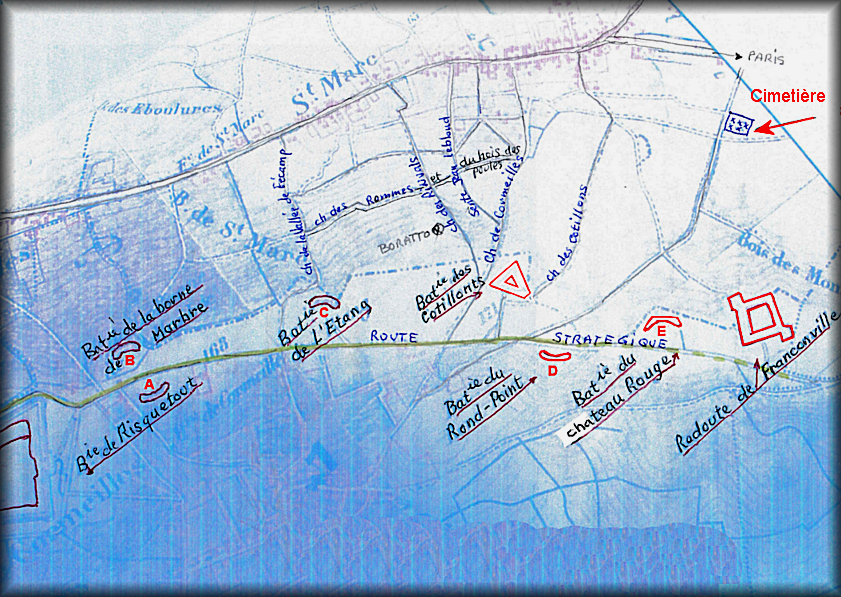 Batterie planBatterie RedouteIl faut rappeler à ce sujet, que suite à "l'invasion éclair" des Prussiens sur Paris en 1870, cette colline, par son emplacement hautement stratégique a été rapidement dotée par les gouvernements de l'époque d'un grand nombre d'édifices militaires de défense pour constituer une ceinture de protection autour de Paris, du nom de "camp retranché de Paris".