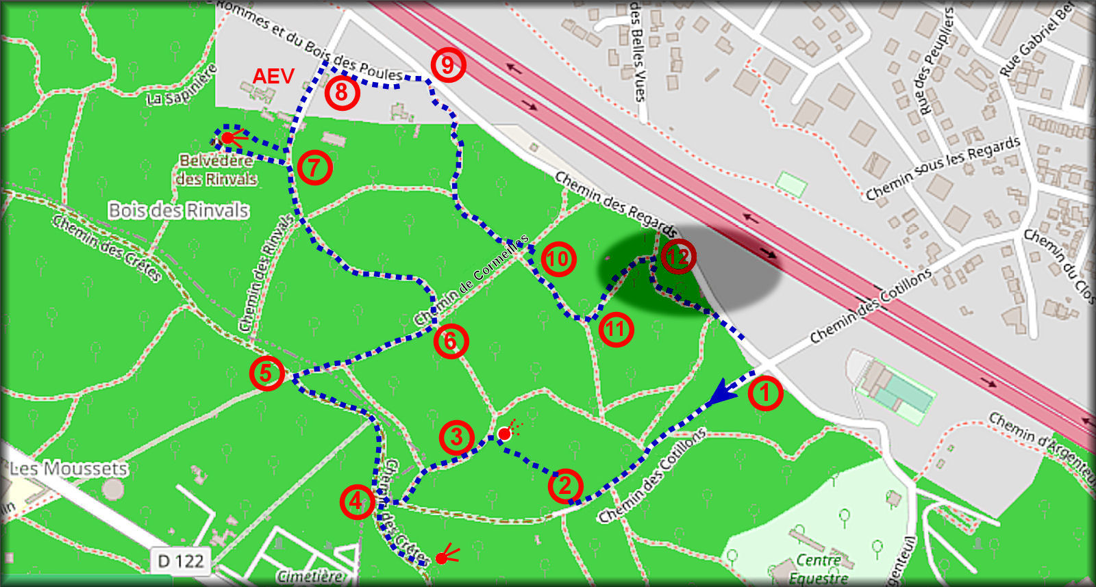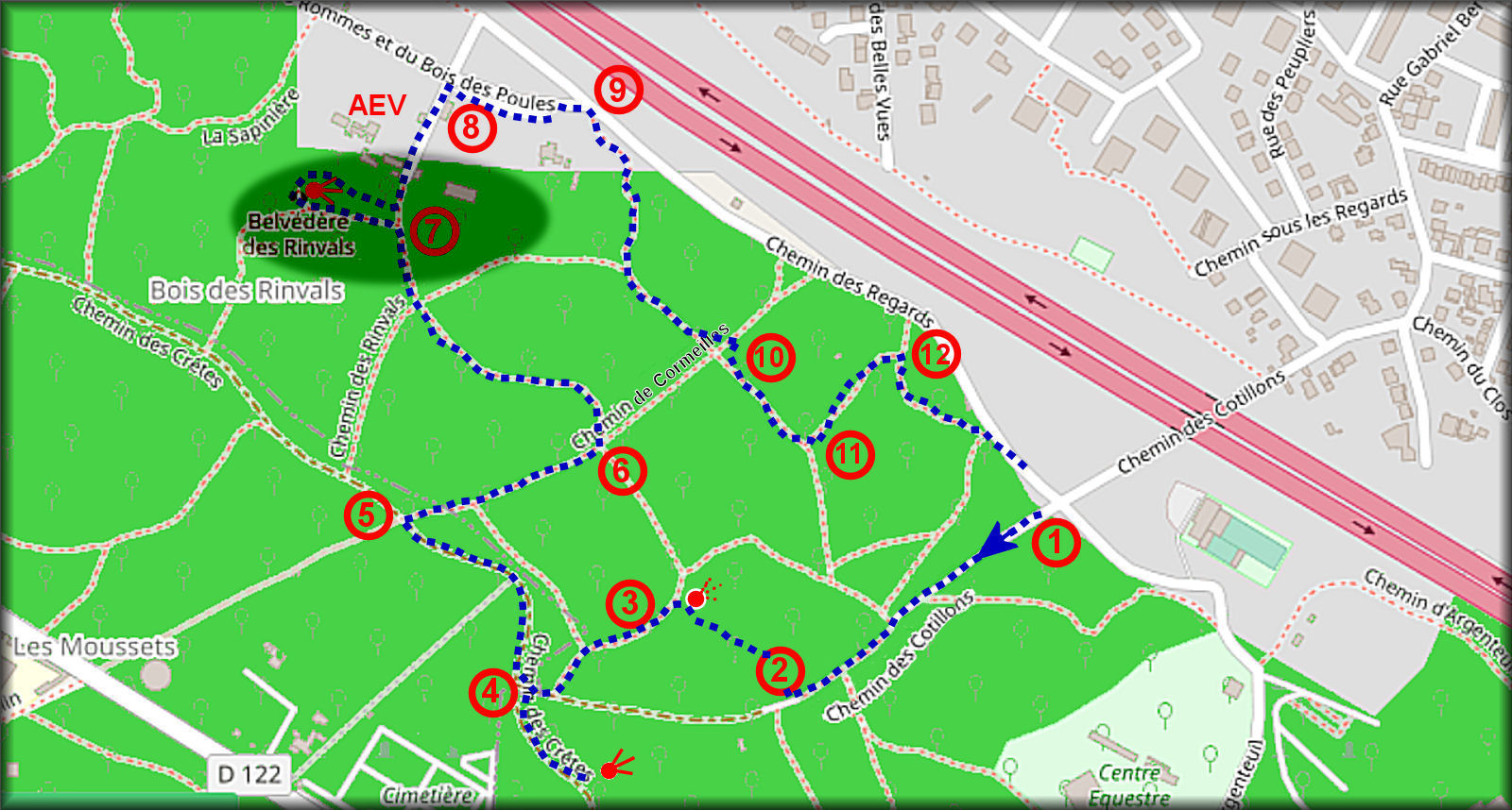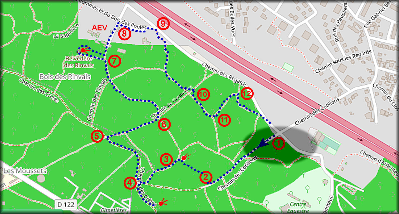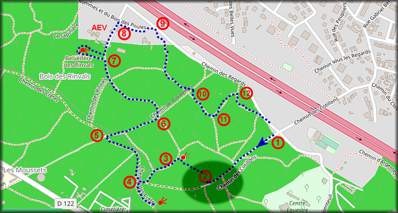 Le départ de ce circuit se situe au croisement du Chemin des Cotillons et du Chemin des Regards, aux panneaux d'information" de l'A.E.V. (face aux jardins communaux de Franconville)