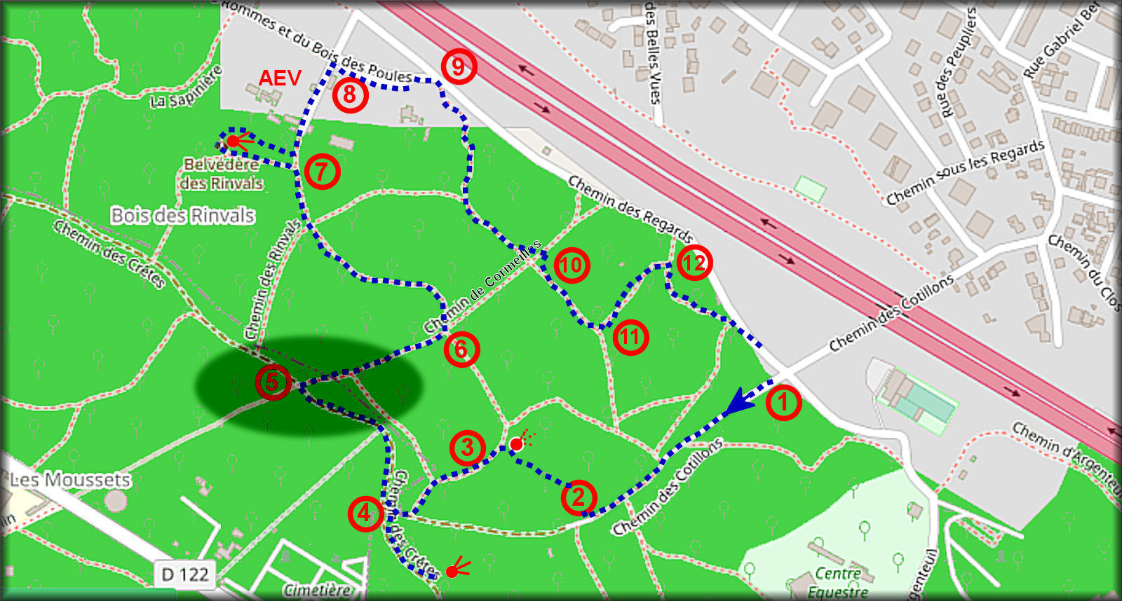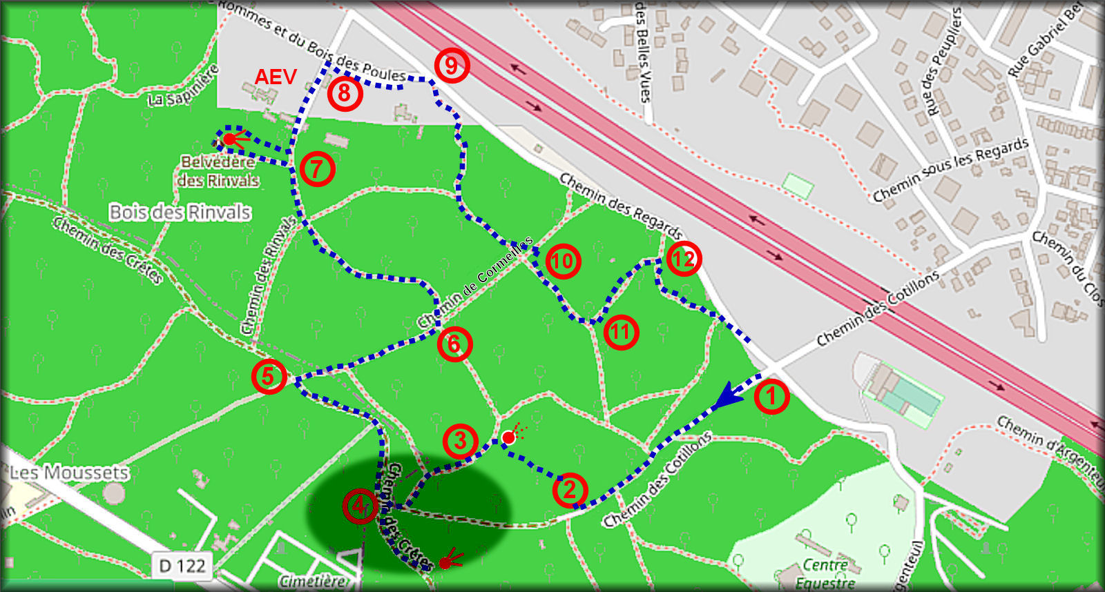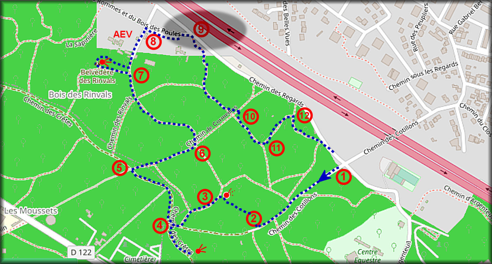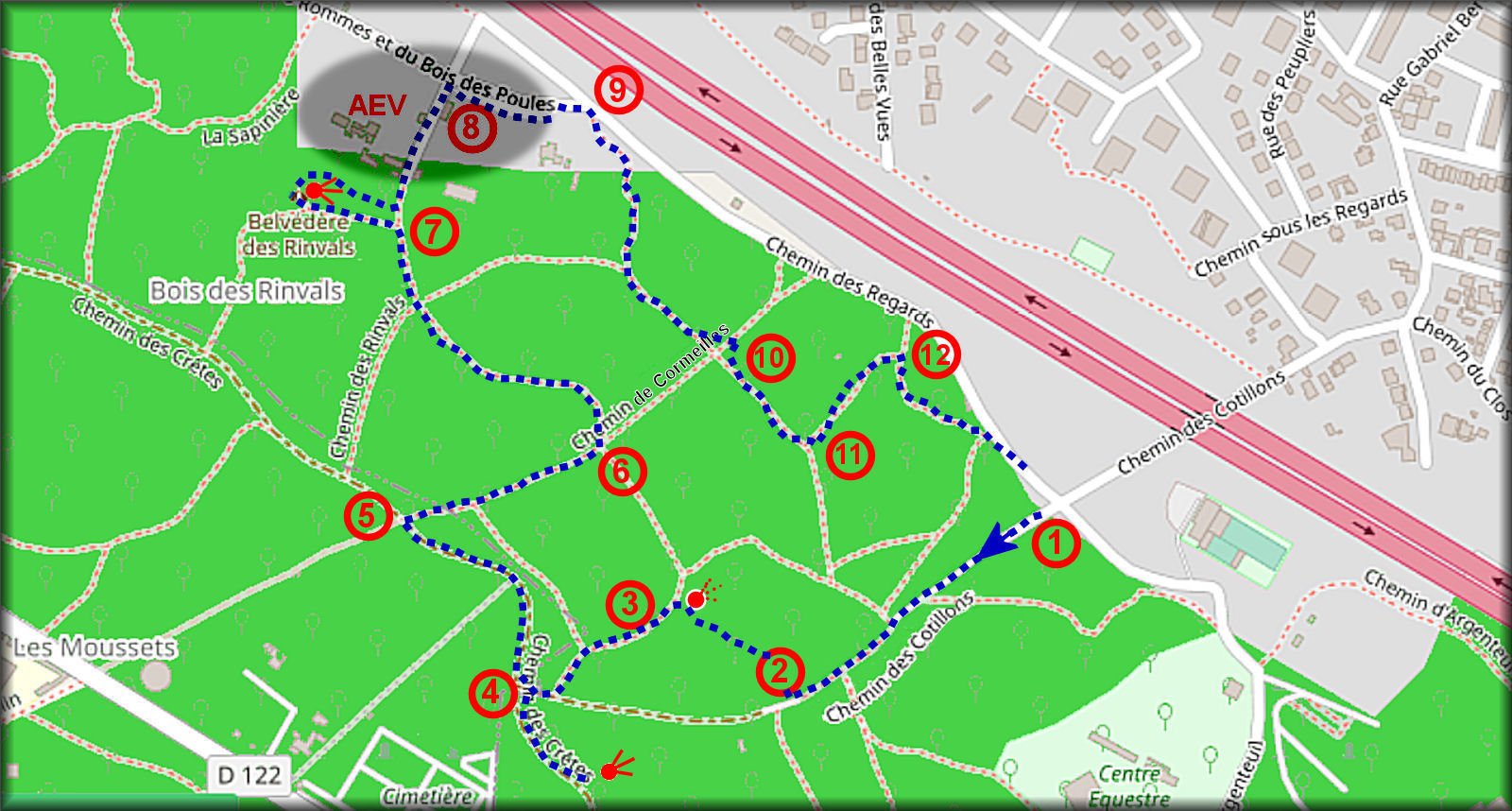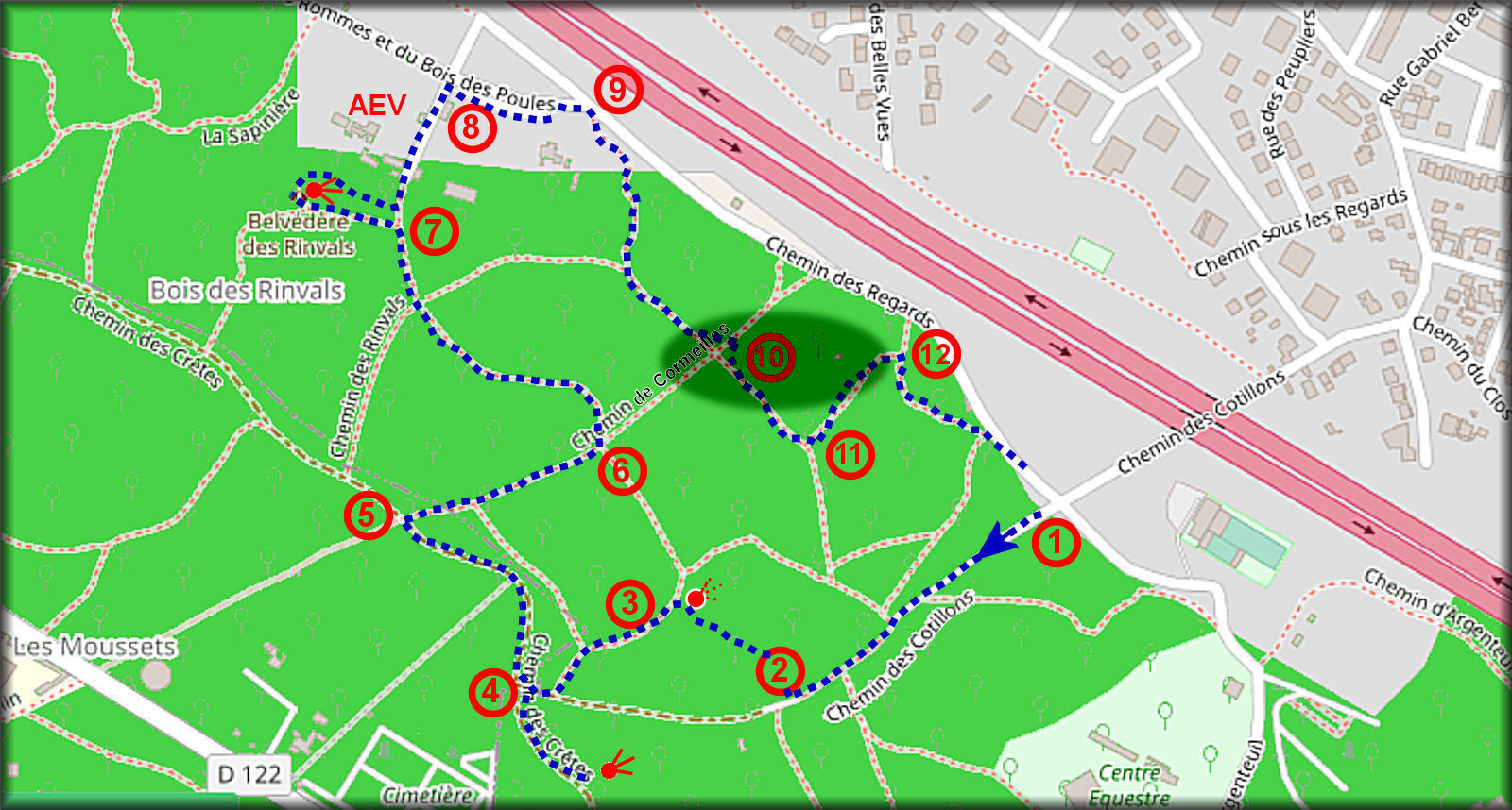Le départ de ce circuit se situe au croisement du Chemin des Cotillons et du Chemin des Regards, aux panneaux d'information" de l'A.E.V. (face aux jardins communaux de Franconville)