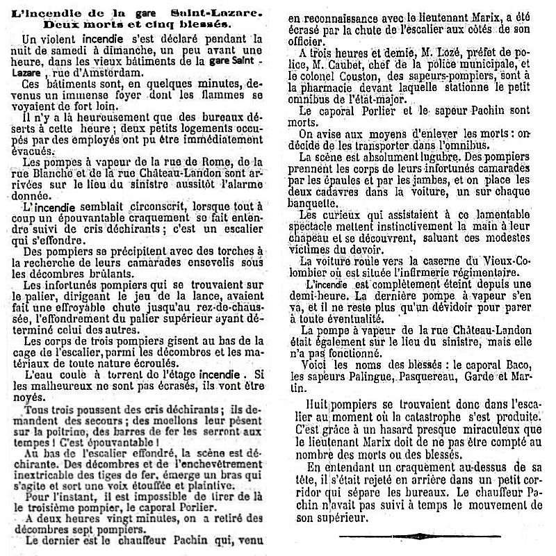 Un violent incendie s’est déclaré durant la nuit du samedi 7 au dimanche du 8 avril 1888 dans les vieux corps de bâtiments de la gare St Lazare, 15-17 rue d’Amsterdam à Paris, entre l’ancienne entrée des voyageurs de banlieue et la grande porte de sortie des voyageurs grandes lignes, dans la partie non encore atteinte par la pioche des démolisseurs.