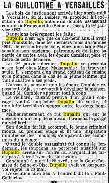 A la fin de l'année 1892, au numéro 8 de la rue de Cormeilles, chez Mme MAISONOBE, Jules-Léon DUPALU âgé de 18 ans, serrurier à Franconville, voisin de Mme MAISONOBE, s'introduit chez elle pour y trouver de l'argent afin de régler ses dettes. Il ne trouvera rien mais surpris, il assassine à coups de couteau les parents de Mme Maisonobe, Mr et Mme COMBIER. Le jugement du 22 avril 1893 condamne Dupalu à mort. Sur les recommandations de son avocat, il signera son pourvoi en cassation. Celui-ci lui sera refusé le 20 mai.