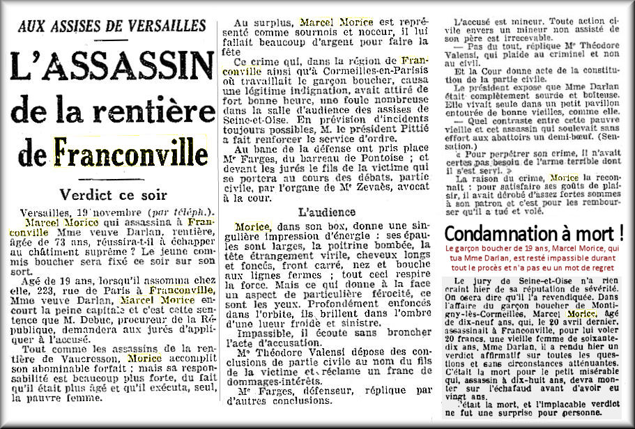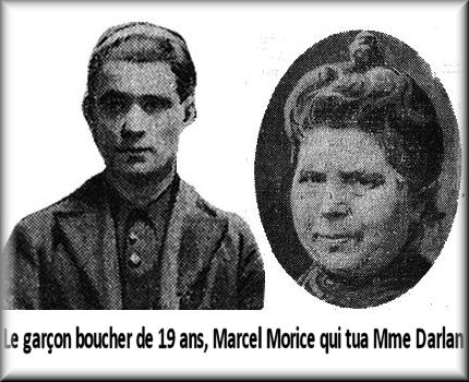veuve Adèle Darlan, une septuagénaire est retrouvée le crâne fracassé. Un jeune garçon boucher, Marcel Morice, s’était présenté au numéro 233 avec de la viande à livrer, il est rapidement soupçonné. Il sera arrêté lors de sa fuite près d'Argentan dans l’Orne. Le vendredi 29 novembre 1929 il est jugé et condamné à mort. Marcel Morice est exécuté le 2 Avril 1930. Pour la dixième fois en dix sept ans, les bois de justice sont montés sous le porche de la prison Saint-Pierre de Versailles.